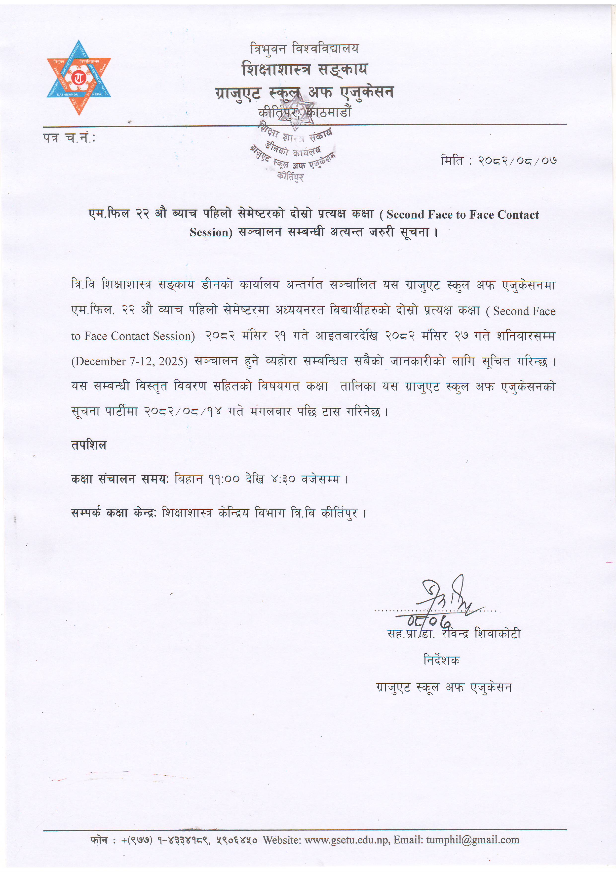 एम.फिल २२ औ ब्याच पहिलो सेमेष्टरको दोस्रो प्रत्यक्ष कक्षा सञ्चालन सम्बन्धी सूचना।